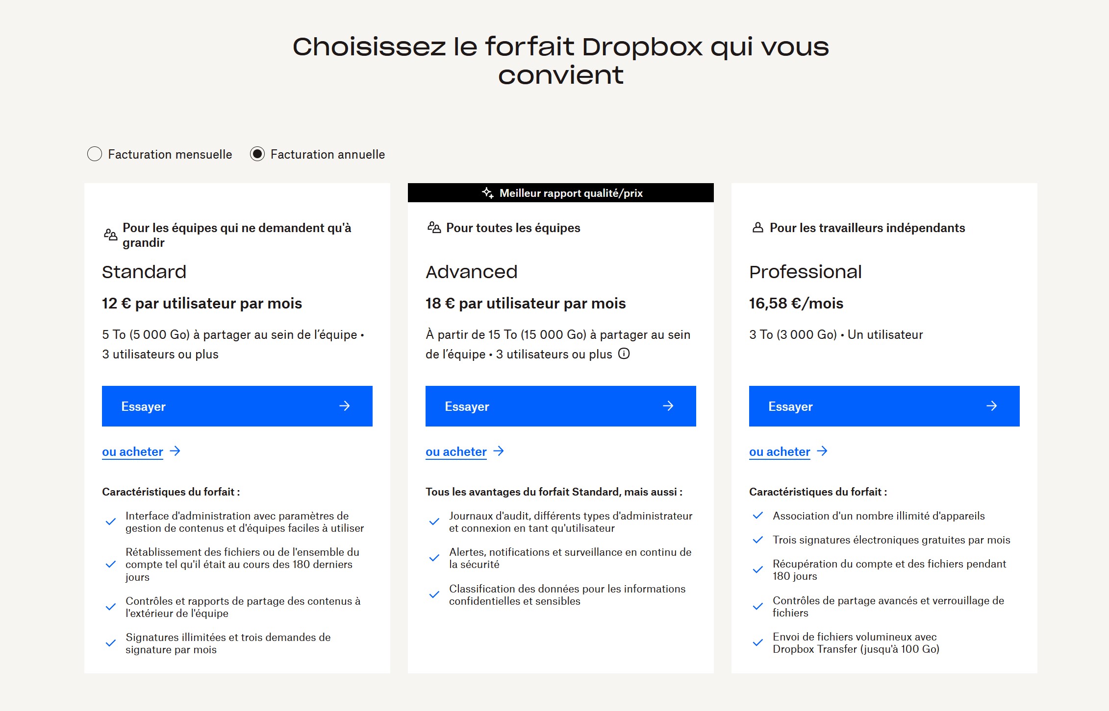 Le nouveau plan "Advanced" de Dropbox offre désormais un espace de stockage partagé de 15 To pour toute équipe, avec la possibilité d'ajouter 5 To supplémentaires pour chaque licence additionnelle, jusqu'à un maximum de 1000 To. Bien que moins attractif que le stockage illimité, ce nouveau modèle permet une meilleure prédictibilité et gestion des ressources pour l'entreprise.