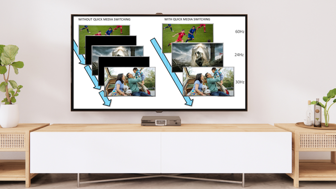 L'Apple TV 4K 2022 est le premier boîtier multimédia à proposer la fonction QMS. Elle permet de passer instantanément d'une fréquence d'affichage à une autre (23,976 Hz, 24 Hz, 50 Hz, 60 Hz, 120 Hz), évitant ainsi l'apparition d'un écran noir temporaire lors du changement de source. Toutefois, cette transition instantanée n'est possible que si les autres paramètres de l'image restent inchangés, tels que la résolution, la couleur et la plage dynamique.