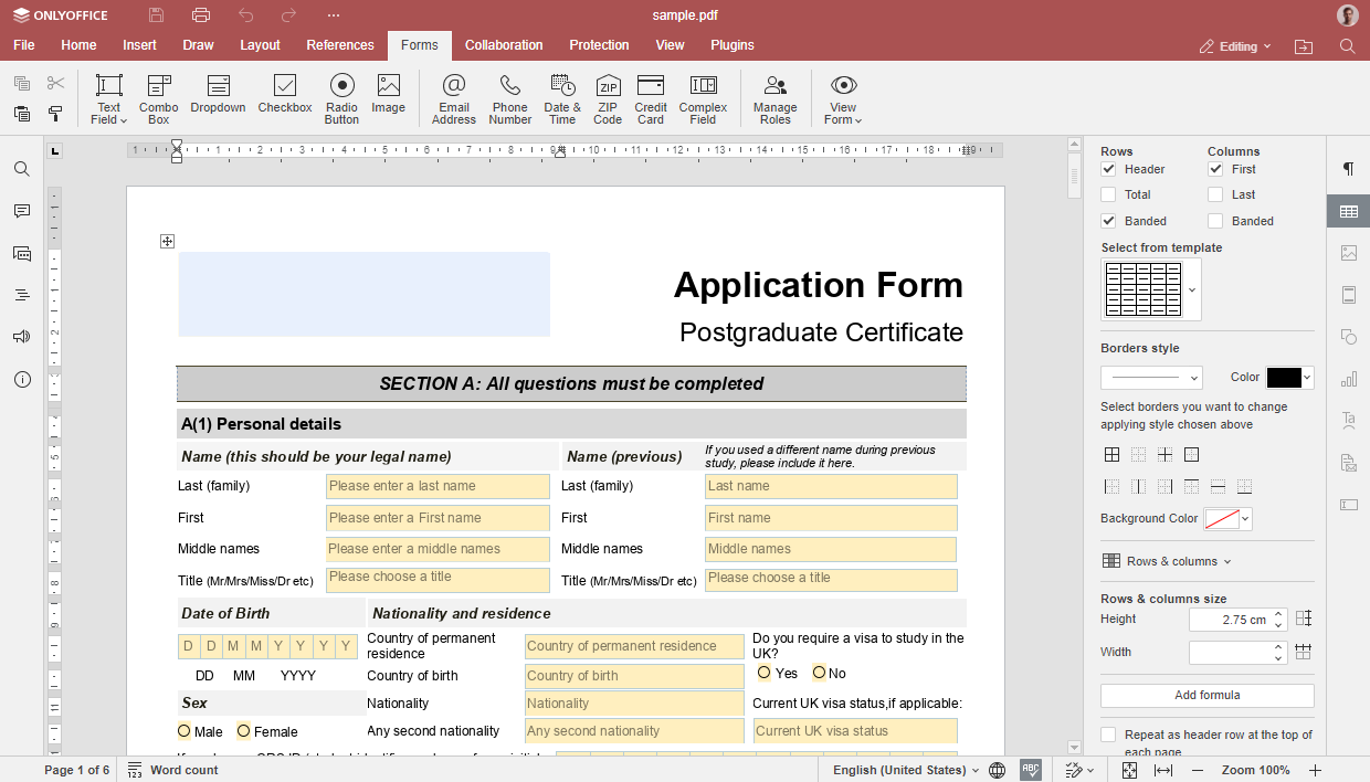 Le nouveau fleuron de OnlyOffice Docs 8.1 est sans aucun doute son éditeur PDF complet. Vous pouvez maintenant non seulement visualiser et annoter des PDFs, mais aussi éditer directement le texte, ajouter ou supprimer des pages, et insérer divers objets comme des tables, des formes et des images.
