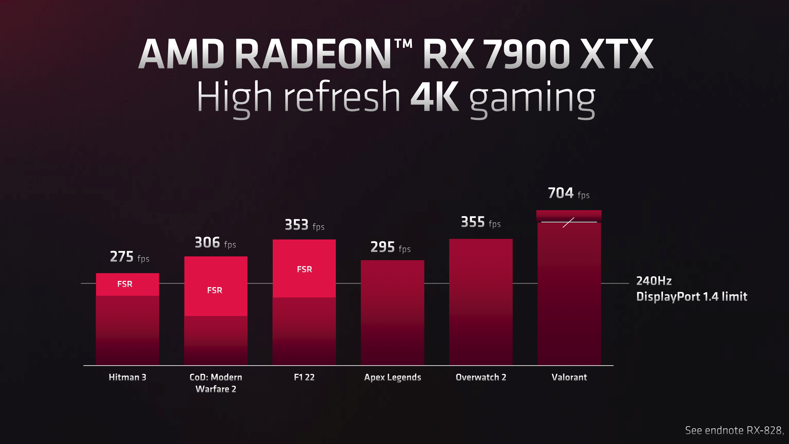 L'arrivée du DisplayPort 2.1 repousse les limites de la connectique 1.4 et AMD n'hésite pas à se faire mousser affichant des scores allant jusqu'à 704 FPS sous Valorant avec FSR activé. Cette évolutivité permet même aux 7900XTX d'atteindre 96fps en 8K ! Ce qui est assez stupéfiant sur le papier. On attendra bien sûr des tests en conditions réelles pour voir si tout cela reste des effets d'annonces ou non, mais il est clair que AMD veut prendre de l'avance et commencer à se projeter dans la 8K qui sera d'ici quelques années un standard pour le commun des mortels.