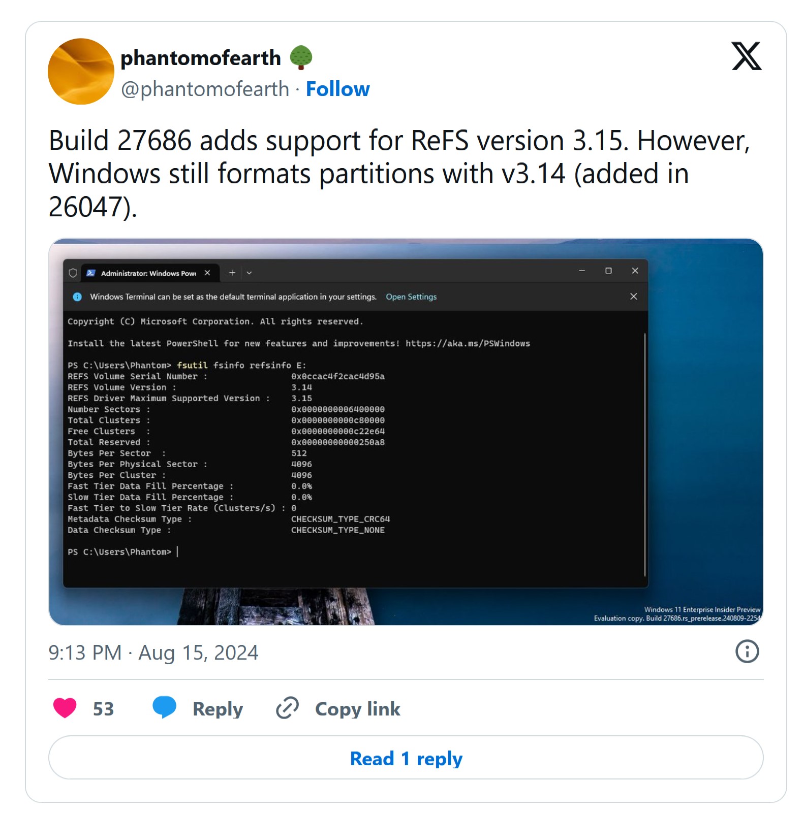 Le Resilient File System (ReFS), conçu pour une résistance accrue aux erreurs et une meilleure performance, passe également à la version 3.15. Bien que Windows formate encore les partitions en version 3.14, ce progrès marque une nouvelle étape dans l’adoption de ReFS, surtout pour les Dev Drives, ces disques virtuels ultra-rapides introduits l'an dernier.
