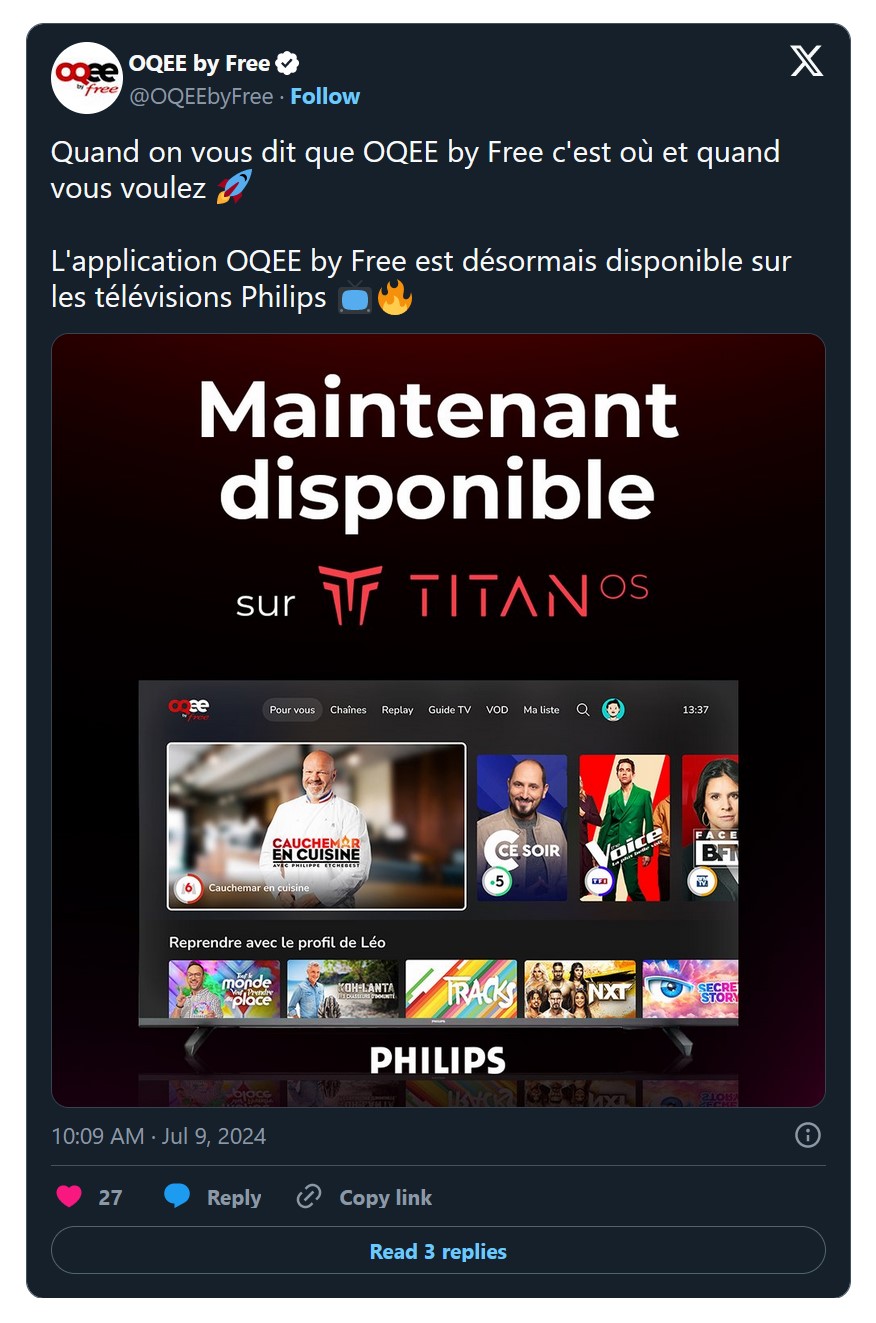 Depuis 2022, les téléviseurs Philips équipés de TitanOS peuvent désormais accéder à l'application OQEE by Free. Cette compatibilité devrait bientôt s'étendre à certains modèles de téléviseurs Philips sortis en 2020 et 2021. L'application OQEE apparaîtra automatiquement sur l'écran d'accueil de ces téléviseurs, permettant ainsi aux abonnés de profiter immédiatement de ce service.
