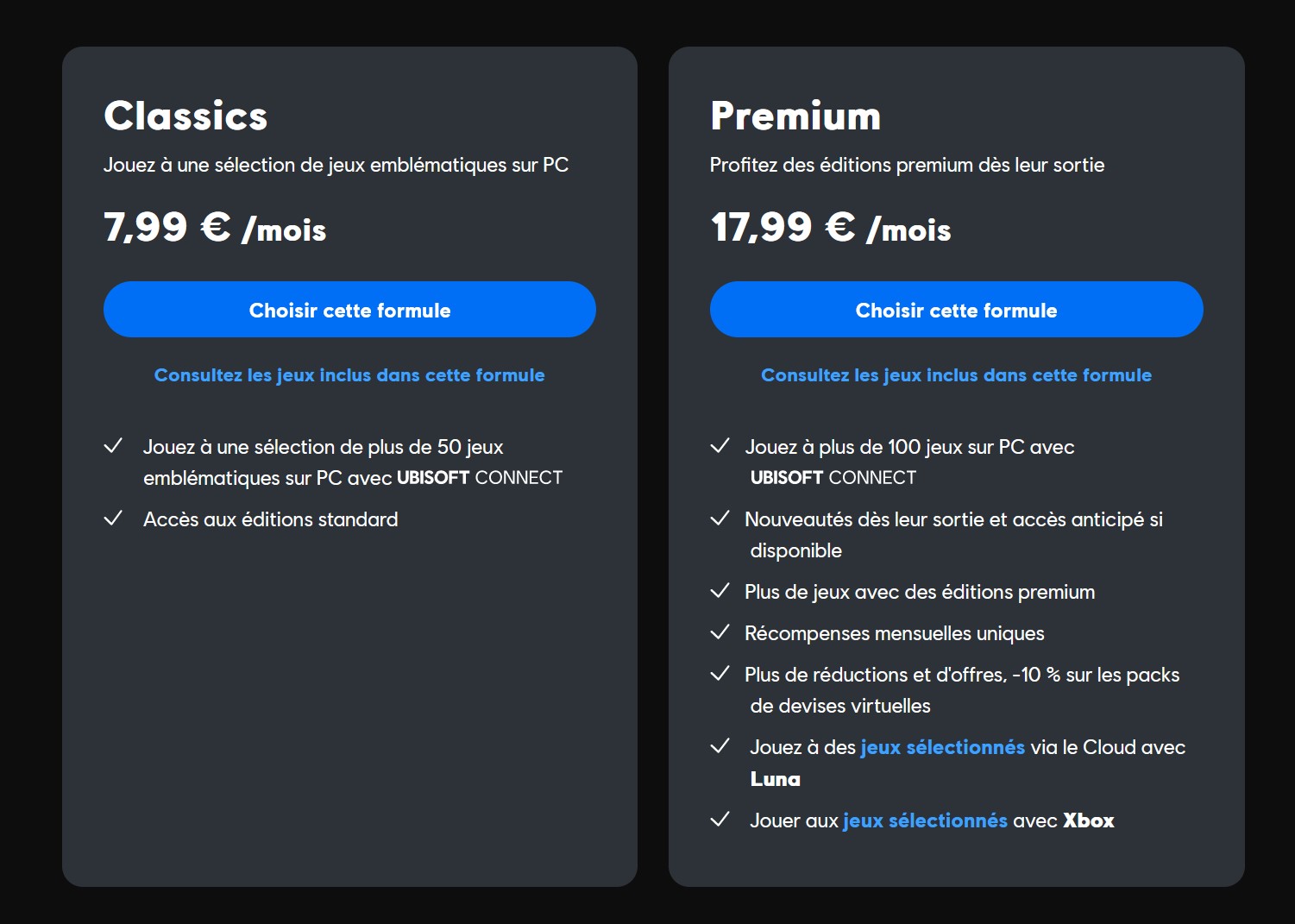 La formule existante d'Ubisoft+, désormais rebaptisée Ubisoft+ Premium, conserve son tarif de 17,99 € par mois. Cette formule offre un accès intégral aux dernières sorties et à tout le catalogue d'Ubisoft, y compris les éditions premium des jeux.