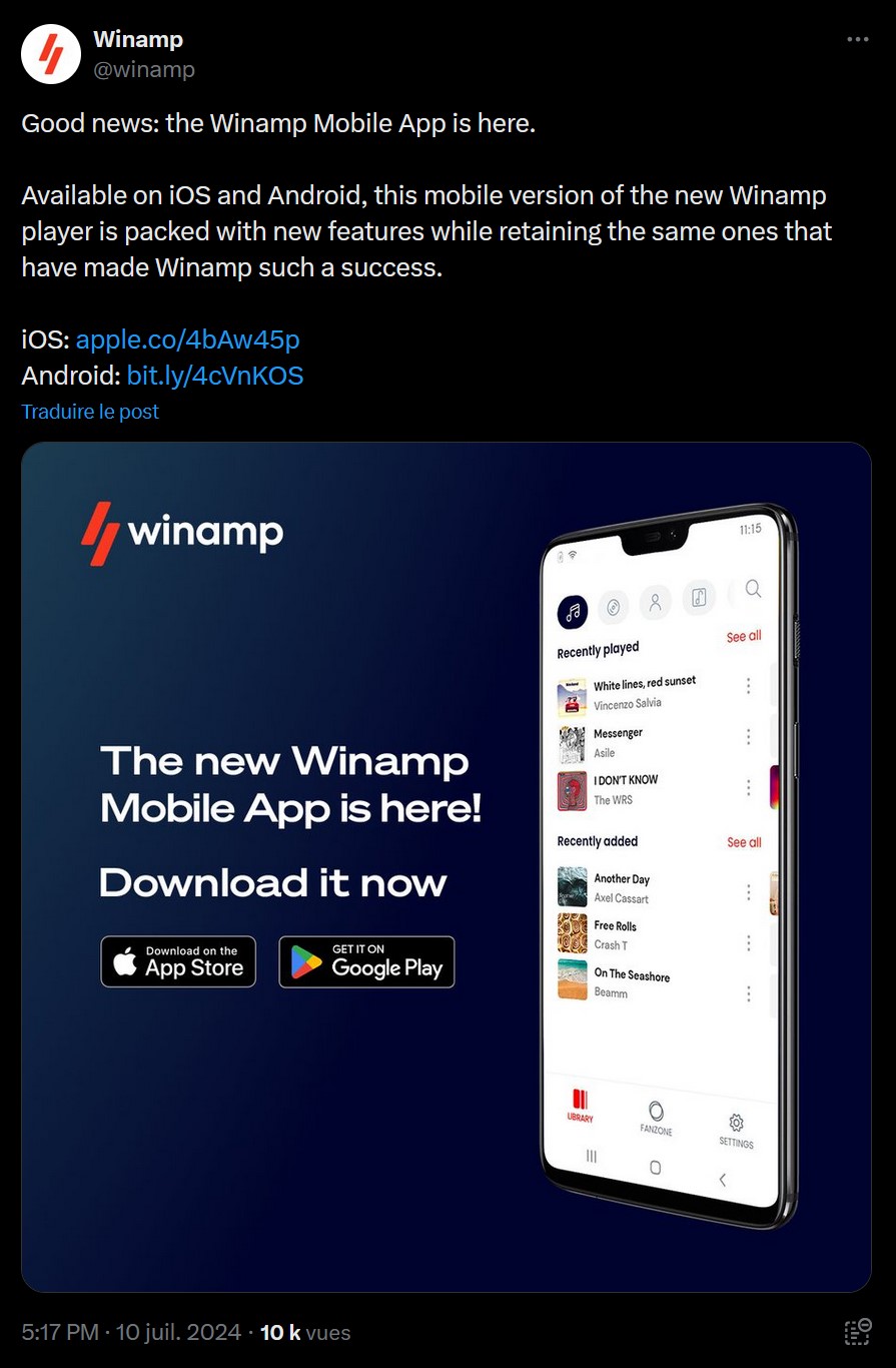 Cette nouvelle itération de Winamp arrive après le lancement d'un lecteur web l'année dernière, marquant ainsi la volonté de la marque de se réinventer pour l'ère du streaming. L'application mobile, développée par Llama Group (actuel propriétaire de Winamp), conserve certaines fonctionnalités emblématiques tout en s'adaptant aux usages contemporains.