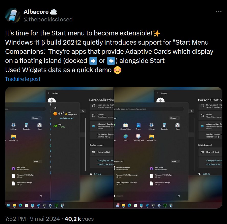 Selon des informations découvertes par Albacore, un analyste reconnu de l'écosystème Windows, Microsoft a intégré cette fonctionnalité dans les dernières versions de test de Windows 11 rendues publiques. Bien que non encore officiellement annoncée, la fonction "Companions" du menu Démarrer permettrait aux développeurs d'étendre les capacités du menu Démarrer avec des widgets qui s'affichent dans un panneau flottant. Ce panneau peut être ancré à côté du menu Démarrer, offrant ainsi une flexibilité d'accès et de visualisation.