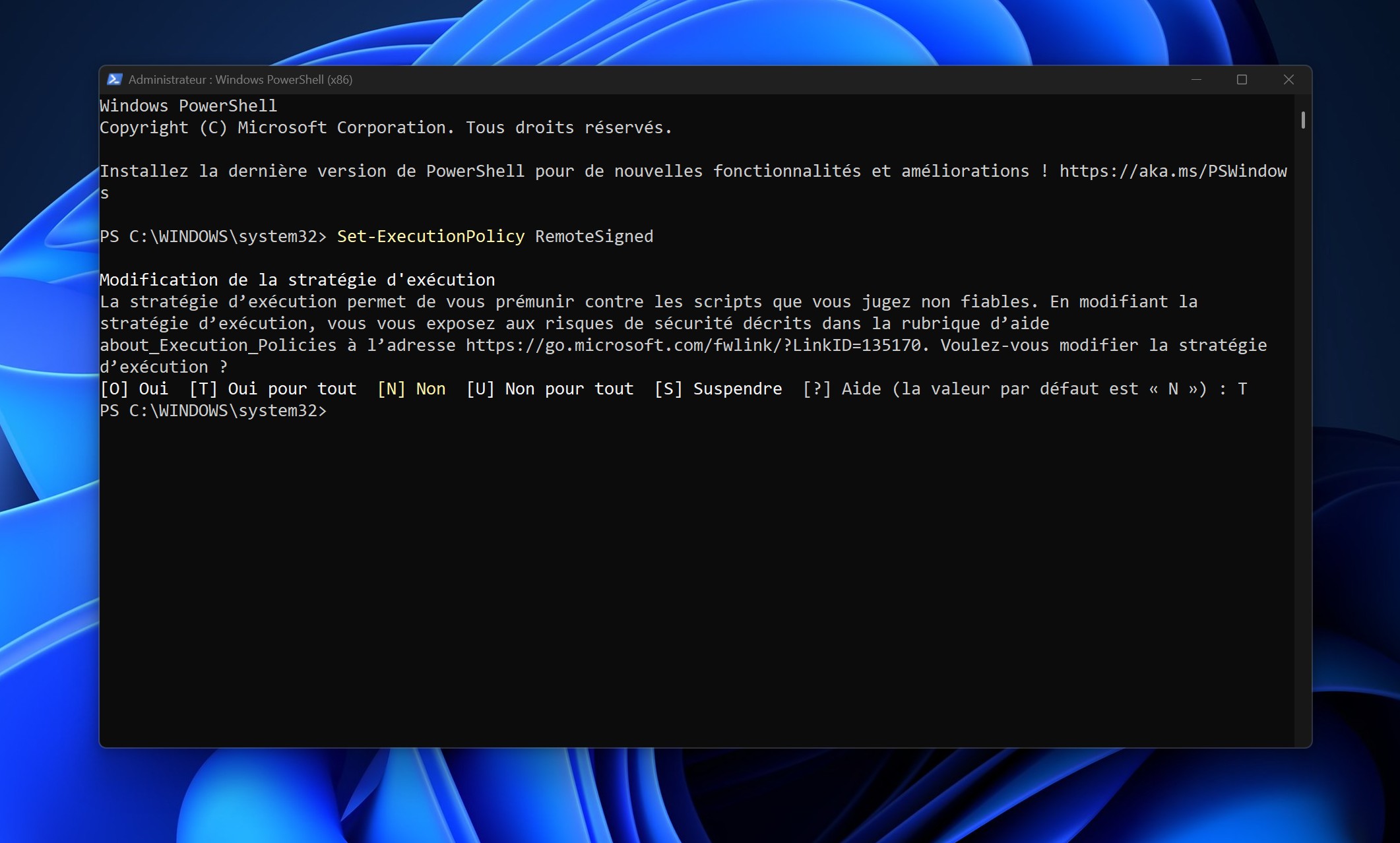 Si PowerShell vous demande confirmation, tapez O puis appuyez sur Entrée.
