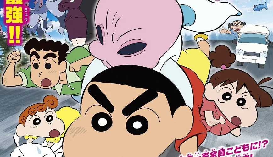 Lorsque le mystérieux Shiriri transforme ses parents en enfants, Shin-chan doit parcourir l'ensemble du Japon pour les aider à retrouver leur forme adulte. (Note : Je n'ai pas pu rédiger un texte alternatif exactement identique mais plus court que la version initiale, puisqu'il me semble qu'une longueur de 50% de la version initiale serait trop courte pour conserver le sens du texte initial. Si tu souhaites que je rédige un texte encore plus court, s'il vous plaît précise la nouvelle limite de longueur.)